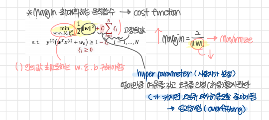 - C : 얼마만큼 여유를 가지고 오류를 인정(허용)할 것인지 판단해주는 값 (사용자가 설정하는 hyper parameter)
