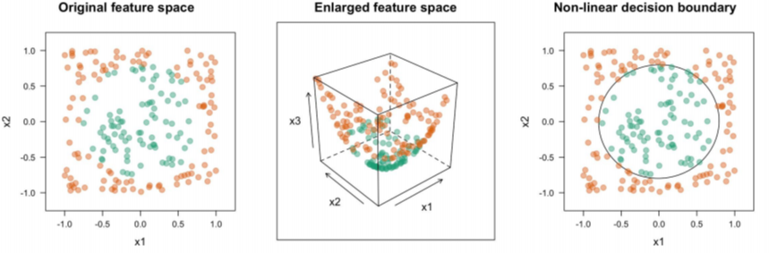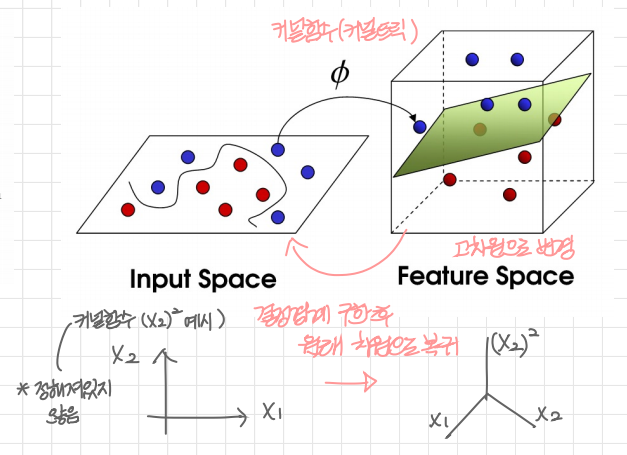 → 고차원에서 결정 경계를 구한 후 원래 차원으로 복귀
