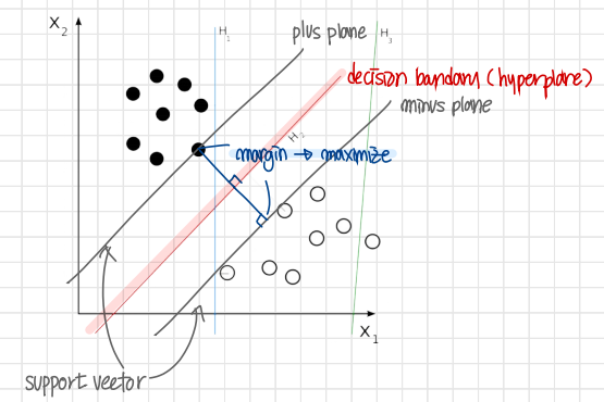 - hard margin : 다른 클래스에 속하지 않고 구분이 됨, 엄격하게 분류